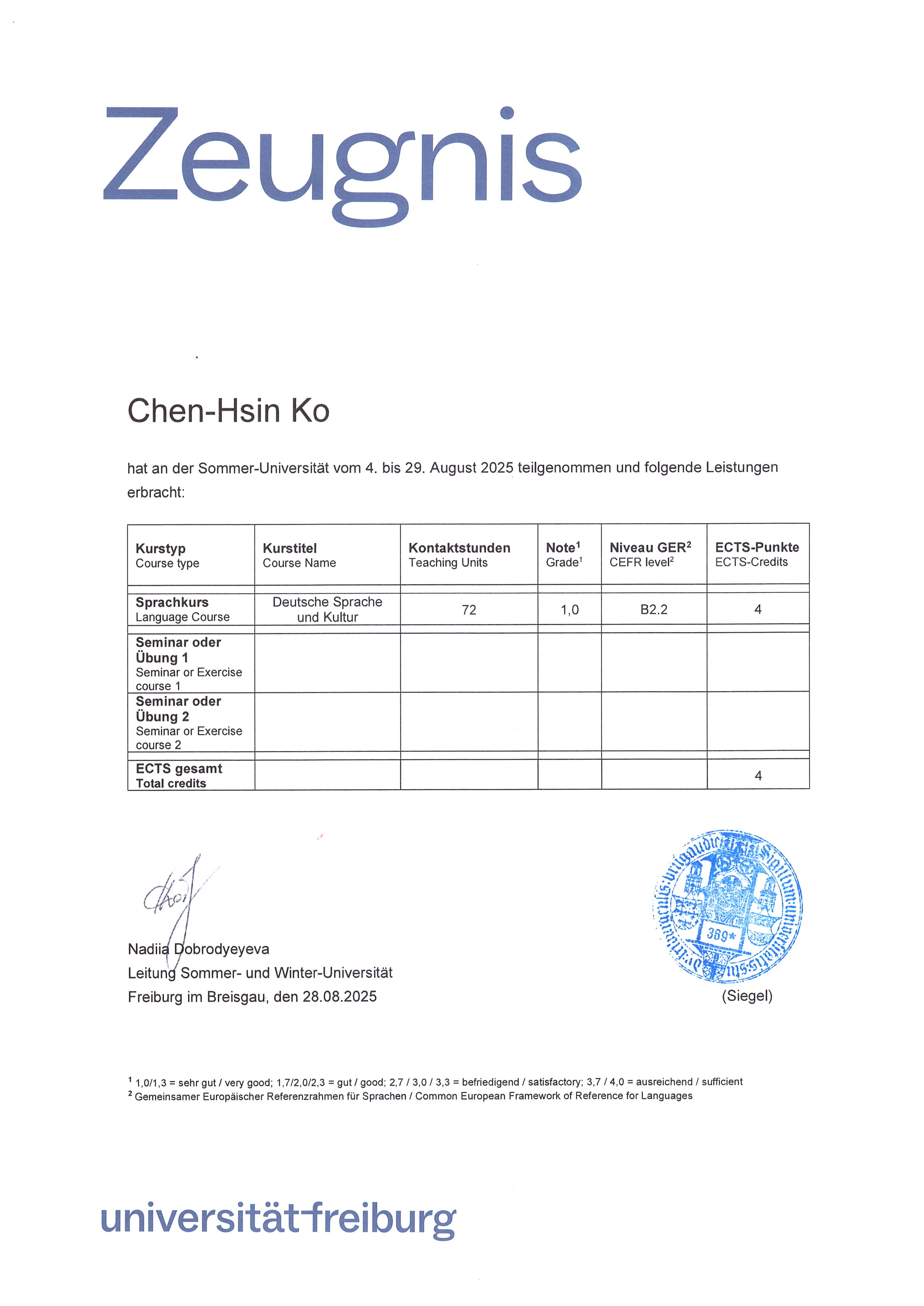 | 小柯先生2025再回弗萊堡 大學-德語高階班 國際營結業證書 |